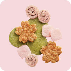 今が盛りと咲き誇る桜を、軽やかな食感の桜葉味のえびせんべいで表現しました。