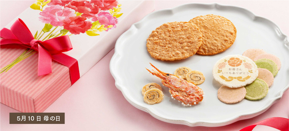 感謝の気持ちを込めたメッセージ入りのえびせんべいやえびの旨みを存分に楽しめるえびせんべいを詰め合わせました。