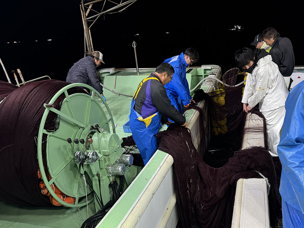 日中は水深200m以下で生活する深海性の桜えびですが、日没前から海面近くまで上昇する習性を持つことから、この時間から漁が行われています。